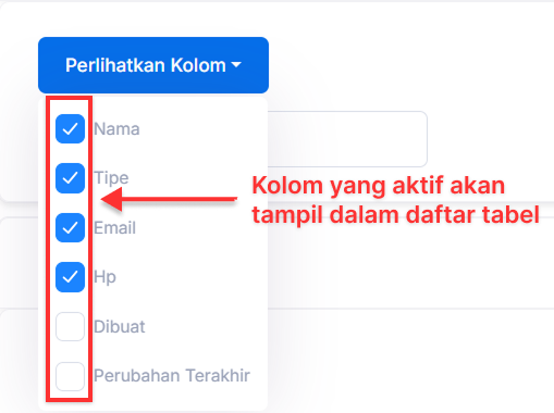 Filter Data pada halaman utama Kontak menghadirkan fitur untuk memilih kolom apa saja yang tampil dalam daftar tabel. Klik 'Perlihatkan Kolom'.