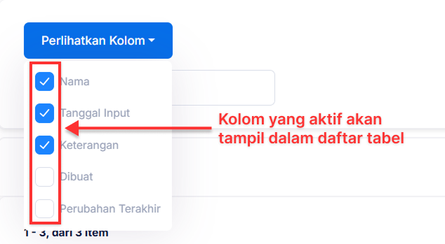 Anda akan melihat daftar opsi pilihan semua nama kolom yang ada. Pilih kolom apa saja yang akan ditampilkan dalam daftar tabel dengan mengaktifkan kolom tersebut.