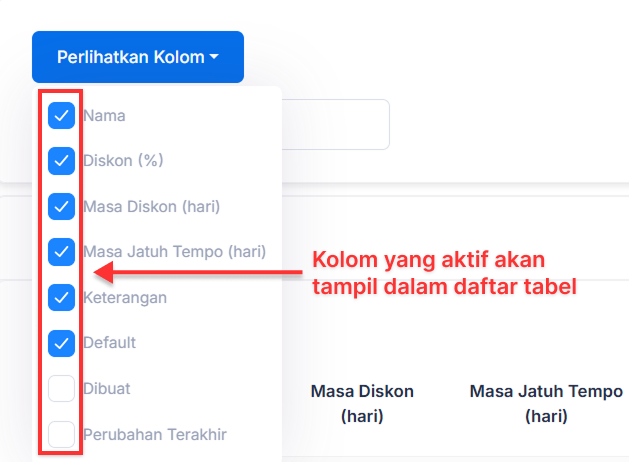 Filter Data pada halaman utama Syarat Pembayaran menghadirkan fitur untuk memilih kolom apa saja yang tampil dalam daftar tabel. Klik 'Perlihatkan Kolom'.