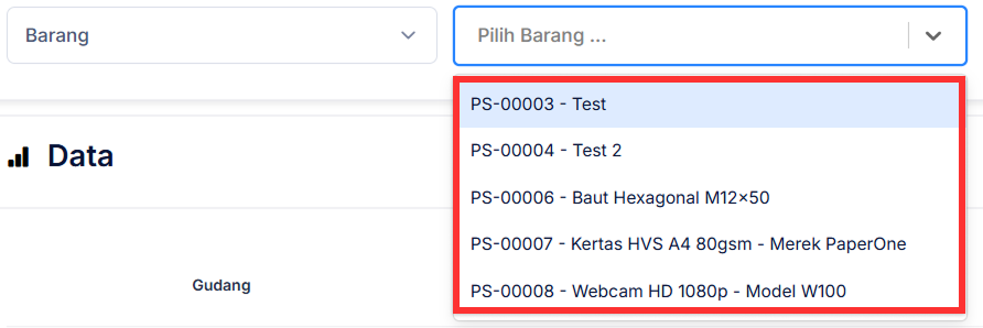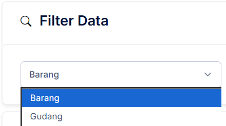 Pada halaman Barang Per Gudang, Atur Filter Data yang diinginkan. Pilih opsi ‘Barang’ atau ‘Gudang’.