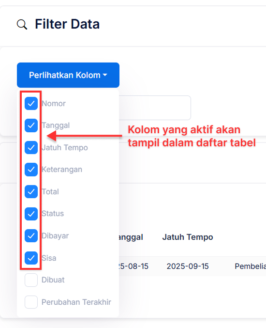 Daftar tabel akan menyesuaikan kolom-kolom yang muncul pada halaman.