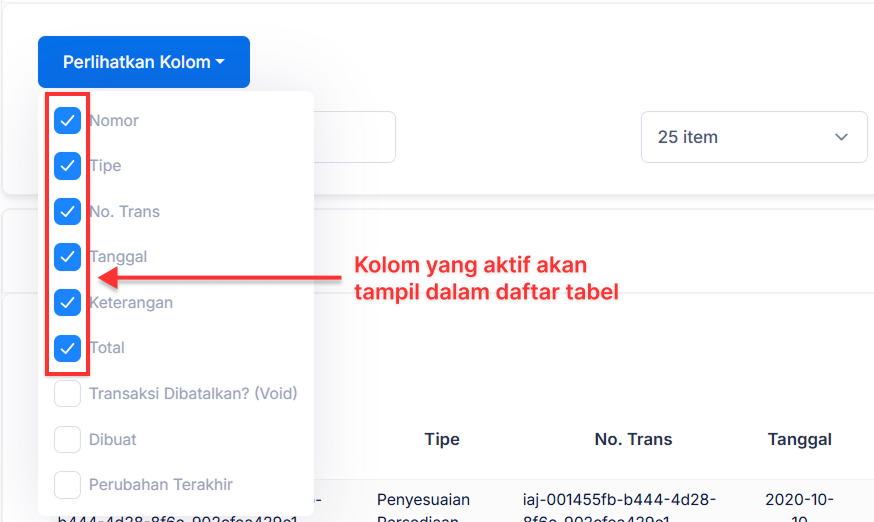 Anda akan melihat daftar opsi pilihan semua nama kolom yang ada. Pilih kolom apa saja yang akan ditampilkan dalam daftar tabel dengan mengaktifkan kolom tersebut.