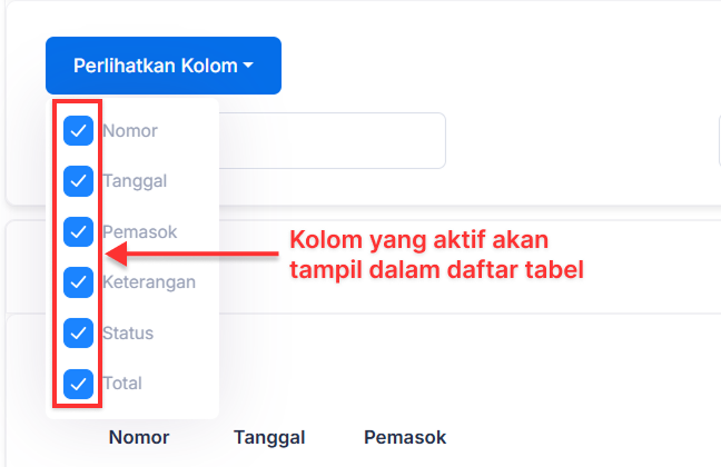 Filter Data pada halaman utama Pesanan Pembelian menghadirkan fitur untuk memilih kolom apa saja yang tampil dalam daftar tabel. Klik 'Perlihatkan Kolom'.