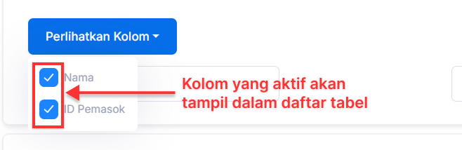 Filter Data pada halaman utama Pemasok menghadirkan fitur untuk memilih kolom apa saja yang tampil dalam daftar tabel. Klik 'Perlihatkan Kolom'.