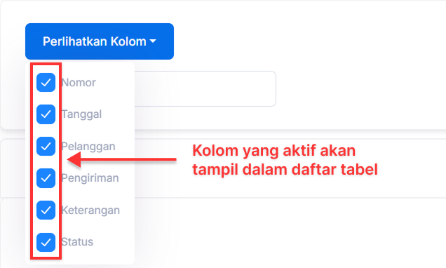 Filter Data pada halaman utama Pengiriman Pesanan menghadirkan fitur untuk memilih kolom apa saja yang tampil dalam daftar tabel. Klik 'Perlihatkan Kolom'.